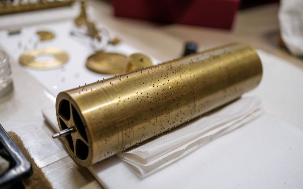 While the base was being dismantled, we inspected the musical cylinder and discovered that it shows traces of former pins that were removed and sanded down, indicating that the tunes have been changed. This alteration probably took place in the 19th century so that the Elephant now plays five tunes.