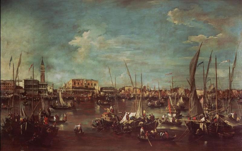 This oil on canvas by Francesco Guardi shows a view from the Piazzetta of San Marco. On the left are the island and church of San Giorgio Maggiore, and, on the right, the church of Santa Maria della Salute.