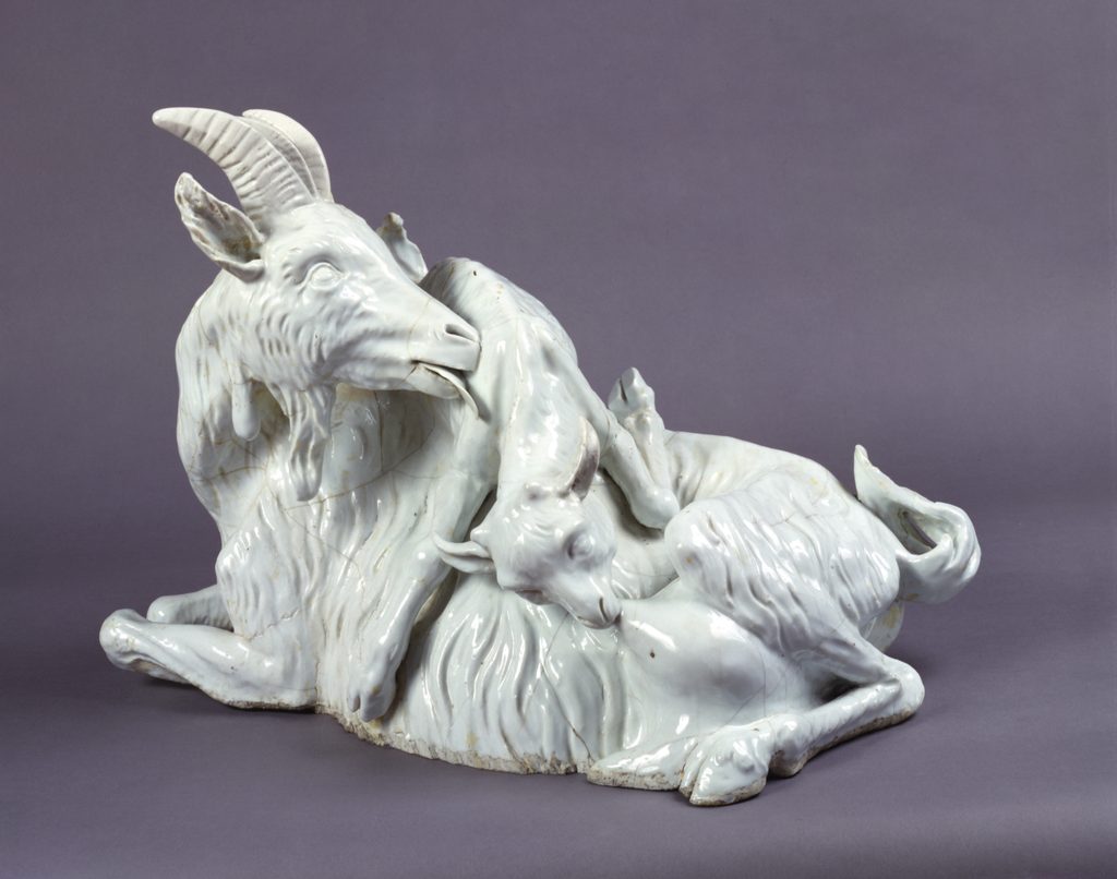 This goat is one of nearly 70 different life-sized animals and birds commissioned in 1730 by Augustus the Strong, Elector of Saxony and King of Poland, for a porcelain menagerie at his Japanese Palace in Dresden. Designed by Johann Joachim Kändler, it was made at the Meissen porcelain factory between 1732 and 1734. Its size demonstrates an unprecedented feat in porcelain production.