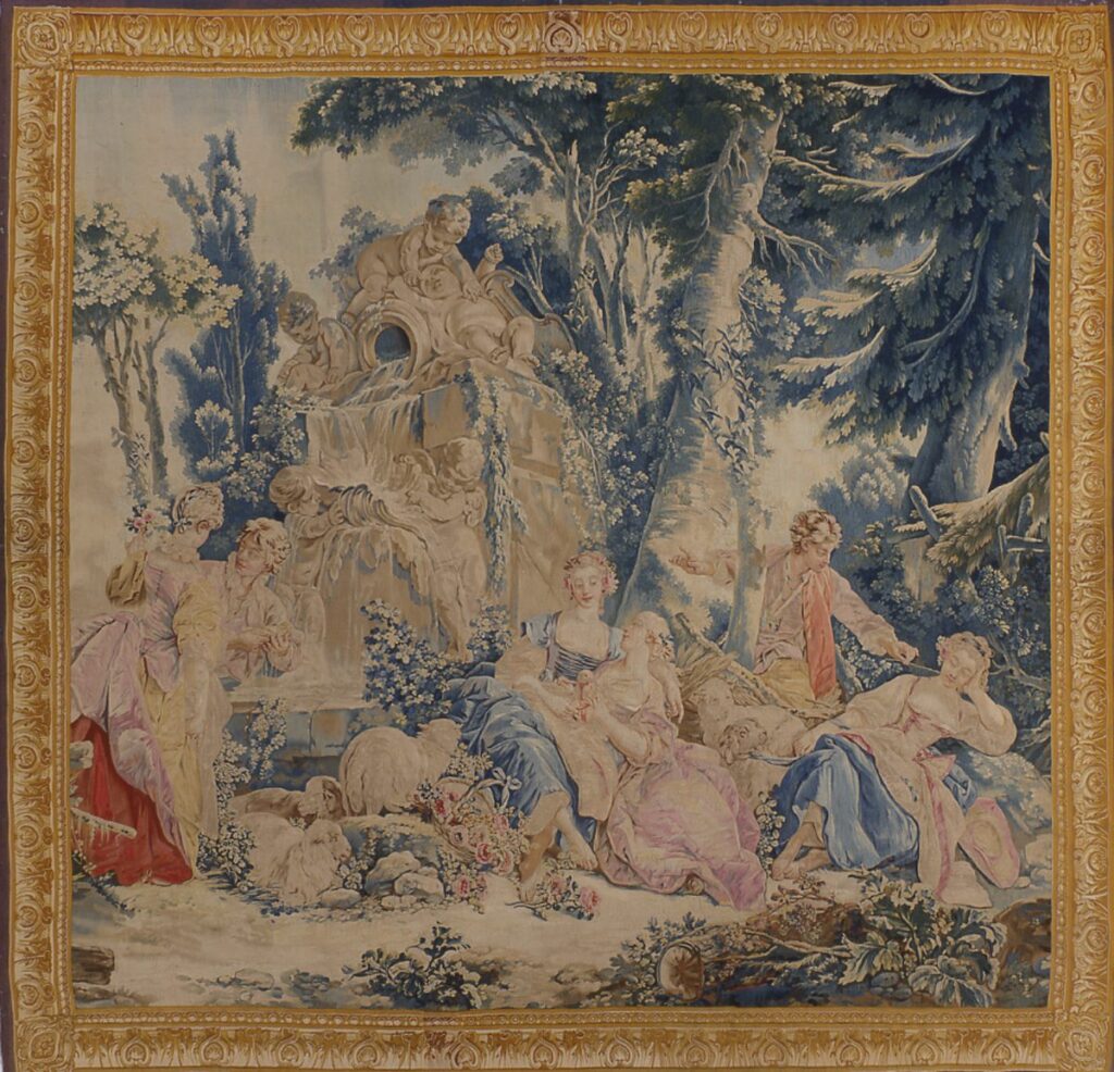 This Beauvais tapestry, made after 1755 is called The Fountain of Love. It was designed by François Boucher as part of a set of six related scenes known as La Noble Pastorale and depicts a scene of youthful flirtation set in an idealised landscape.