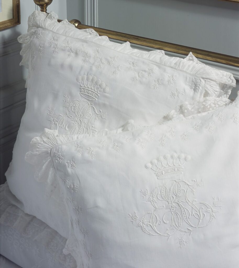 These beautifully embroidered pillowcases with the monogram E&F de R were probably made in celebration of Ferdinand and Evelina’s wedding. Ferdinand, the builder of Waddesdon, married his English cousin Evelina in 1865, having known her since childhood. Their happiness was sadly short-lived; Evelina died in childbirth the following year, leaving Ferdinand inconsolable. He never re-married.