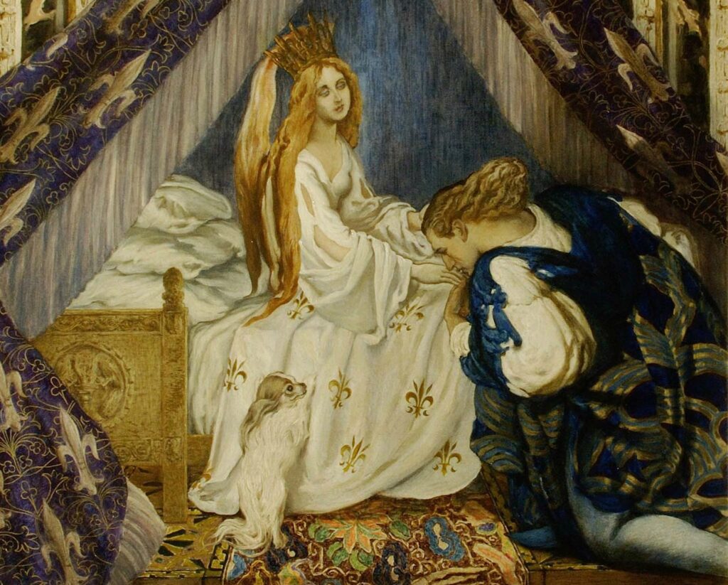 In this painting by the Russian artist and designer Leon Bakst, Sleeping Beauty is woken by the Prince with a kiss. This is the final panel of seven that tell the story of Sleeping Beauty. The panels were originally commissioned by James and Dorothy de Rothschild for their London townhouse in 1913.