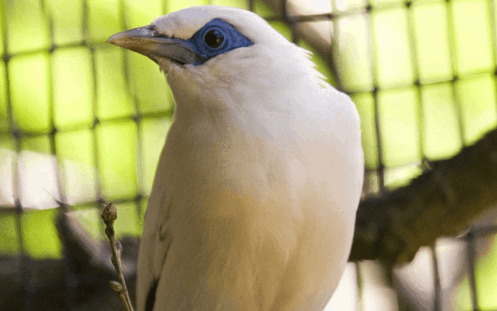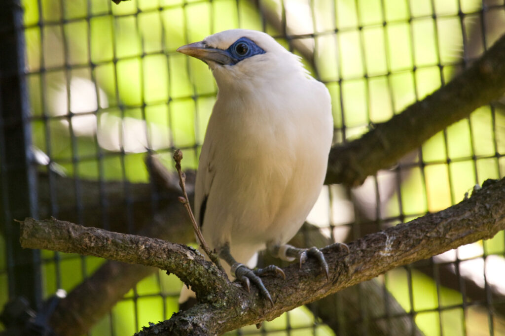 (Leucopsar rothschildi), a snowy white bird with a startling blue eye mask native to Bali,